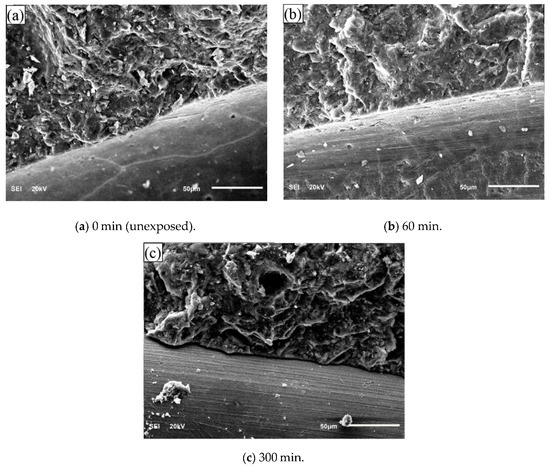 Ahmad et al. [101] investigated the microstructure of the matrix–fiber interface of steel-fiber-reinforced high-performance concrete exposed to high temperatures. As is shown in Figure 13, their results indicated that the matrix–fiber bond strength degraded gradually with increasing exposure time. Moreover, after a period of high-temperature exposure of SFRC, the matrix–fiber bond ruptured progressively and hence thus gradually reduced the activation efficiency of steel fiber, which may be due to the contraction arising from the discharge of capillary water and the long-term decomposition of some hydrates at high temperatures. However, it can only reduce the contribution of steel fiber to the high-temperature performance of concrete, rather than eliminate the effect. A few studies [11,13,41] have concluded that steel fiber improved the microstructure of RPC after an elevated temperature. In addition, the investigation of Chen et al. [13,42] indicated that steel fibers positively affected the microstructure of RAC after a high-temperature exposure.