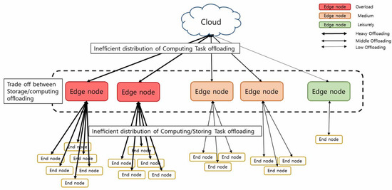 Inefficient distribution computing/storing offloading: Edge computing means offloading work to the edge node closest to the terminal from which data is generated. Thus, if an event occurs at a location, data will surge at all end nodes around that location and this will be concentrated the data and computing tasks are collected to the nearest edge node. When faced with this situation, offloading of storing/computing tasks is focused only on specific nodes as shown in the figure. Therefore, inefficient splitting of storing/computing offloading occurs when an overload occurs only at certain edge nodes and some nodes are relaxed. As a result, overload occurs only at certain edge nodes, and some nodes save too much space, resulting in inefficient partitioning of storing/computing offload.