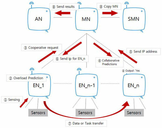 We describe the process by applying scenarios to the cooperative processes listed from 1 to 8. The scenario is when the temperature rises rapidly, and the wind direction changes frequently. First, EN_1 collects and processes data in real-time. EN_1 collects and processes data in real-time through sensors. Task1 starts to predict the forest fire when an event that rapidly increases in temperature occurs. The assumption is that the initial fire suppression failed. The following tasks performed to predict the diffusion range and speed through data such as wind direction and wind speed. EN_1 rapidly increases the workload. The master node monitors all edge nodes in real-time and predicts the overloaded if the energy of EN_ 1 increases and exceeds the threshold. EN_1 is the overload, and the EN_1 requests cooperation from the Master Node to find the cause of the overload first. The master node divides into data and tasks to find edge node problems. The two algorithms decide the part to collaborate based on the causes of data collection and processing and task analysis. For example, in the case of a task offload problem, use the ‘Task-centric algorithm’. The algorithm rearranges the parts to collaborate as in the example in Section 3.4.