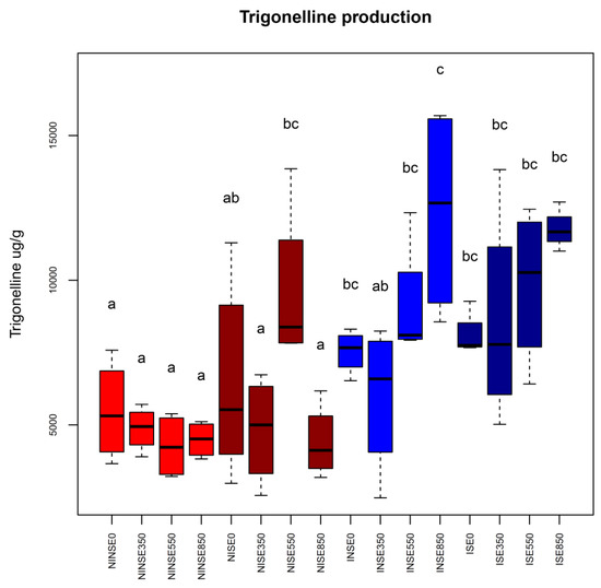 Boxplots representing trigonelline production in the different conditions (NI, I: not-inoculated and inoculated plants, respectively; S, NS: water stressed and non-stressed plants; E0, E350, E550, E850: different ethephon concentrations in ppm). Different conditions were color coded as follows: red and brown boxes represent not-inoculated plants (NI) non-stressed (NS) and water stressed (S), respectively; blue and dark-blue boxes represent inoculated plants (I) non-stressed (NS) and water stressed (S), respectively. Letters are plotted according to outcomes of Tukey’s test.