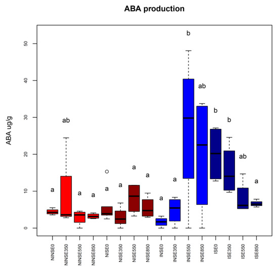 Boxplots representing abscisic acid (ABA) production in the different conditions (NI, I: not-inoculated and inoculated plants, respectively; S, NS: water stressed and non-stressed plants; E0, E350, E550, E850: different ethephon concentrations in ppm). Different conditions were color coded as follows: red and brown boxes represent not-inoculated plants (NI) non-stressed (NS) and water stressed (S), respectively, while blue and dark-blue boxes represent inoculated plants (I) non-stressed (NS) and water stressed (S), respectively. Letters are plotted according to outcomes of Tukey’s test.
