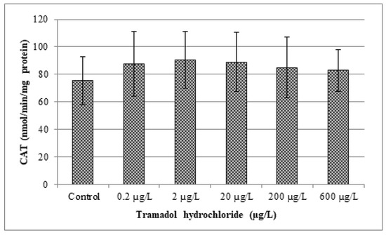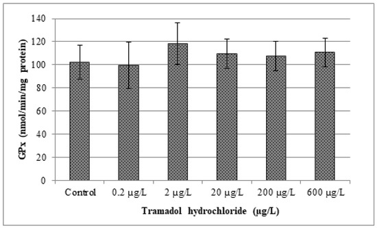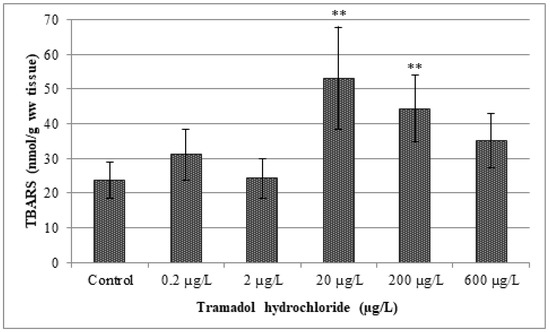 The results of our study indicate a significant increase in lipid peroxidation after exposure to tramadol hydrochloride. In particular, TBARS levels were increased among groups in comparison to the control, but a statistically significant (p < 0.01) difference was observed only in concentrations of 20 and 200 µg/L of tramadol hydrochloride. Surprisingly, TBARS values were not significantly increased in the highest tested concentration, i.e., 600 µg/L. The explanation for these results might be, as suggested by Sehonova et al. [12], that higher concentrations of tramadol hydrochloride may induce an antioxidant effect.