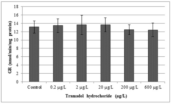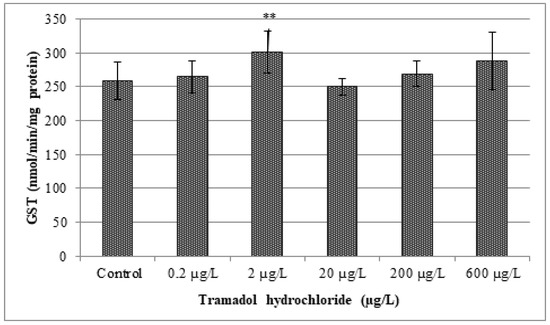 In our study, changes in various antioxidant enzyme activities (CAT, GR, GPx and GST) and lipid peroxidation were evaluated. Obtained results are given in Figure 2, Figure 3, Figure 4, Figure 5 and Figure 6. In our study, fish exposed to tramadol hydrochloride did not show any considerable changes in GR, GPx or CAT activities between control and experimental groups. Surprisingly, a significant increase in GST activity was recorded only at the concentration of 2 µg/L (p < 0.01), compared to the control group. No changes were recorded in higher concentrations. An increase in GST activity, mainly in low environmentally relevant concentrations, was also found by Zivna et al. [45]. They studied the effect of salicylic acid on zebrafish, after 28 days of exposure. An increase in activity of the detoxification enzyme GST probably indicates an activation of antioxidant system against xenobiotic. A similar study was performed by Sehonova et al. [27]. They examined effects of tramadol hydrochloride on common carp (Cyprinus carpio) embryos and larvae. No changes in GR and GST activities after tramadol hydrochloride exposure were reported. In contrast, they observed a significant reduction in GPx activity at the highest concentrations of 100 and 200 µg/L of tramadol hydrochloride. Furthermore, Sehonova et al. [12] did not find differences in GR activity after exposure of a mixture of tramadol hydrochloride and naproxen sodium in common carp. They noticed a significant drop in GST activity, but only at a concentration of 100 µg/L. Likewise, they recorded a decrease in GPx activity among various groups exposed to a mixture of tramadol hydrochloride and naproxen sodium (50, 100 and 200 µg/L).