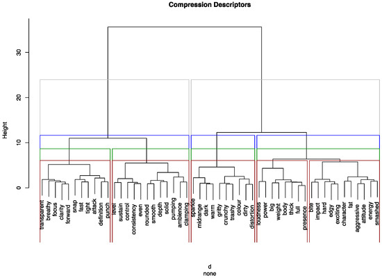The similarity matrix was completed by twelve experts, all of which had participated in the previous stage. The results were averaged to take the mean score for each descriptor and clustering was conducted using the Euclidean distance and Ward methods. The statistical software R was used to generate the dendrogram shown in Figure 1. As shown in the dendrogram, there are several subsets, illustrated in brown, green, blue and grey. Inspection of the grey subset highlights descriptors which appear to fall into two main categories, one relating to dynamics and the other pertaining to colouration and distortion (linear and non-linear distortion). Looking at a lower branch in the dendrogram highlights that aggressive is grouped with, among other words, attitude, energy and smashed. All of these words are subjective and have not been defined in any of the previous literature. Moreover, one could argue these descriptors relate to the character of the compressor and are potentially multi-dimensional attributes. Referring back to the descriptors used in Table 1, this shows that contentions made previously regarding the meaning of these words are generally correct. As an example, the terms dirt and gritty are connected to distortion in the brown subset. Pumping is connected to ambience (which is understandable as compression-related amplitude modulation often manifests as quick changes in the amplitude of the ambience present in the program material). Finally, punch is connected to definition and also attack, which would support the notion that this descriptor is related to the manipulation of transient shapes.