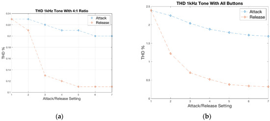 (a) Total Harmonic Distortion (THD) as a function of attack and release using a 4:1 compression ratio and a 1 kHz test tone; (b) THD as a function of attack and release using the “all-buttons” compression ratio and a 1 kHz test tone.