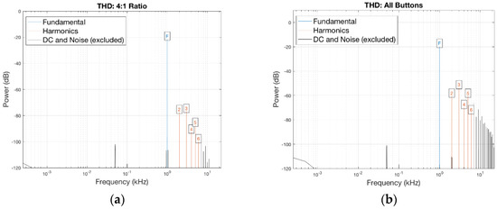 Figure 3a,b are plots created using Matlab’s THD function. They represent an FFT display which illustrates the nature of the harmonic distortion. To create the plots, a 1 kHz tone was input to the compressor to achieve −10 dB of gain reduction, with the time constants set for attack at three and release at seven. The output of the compressor using a 4:1 ratio and the all-buttons mode was then recorded into a DAW at 22 bit/44.1 kHz. The figures make clear the differences in distortion characteristics between the 4:1 ratio and the all-buttons mode. As one might expect, the distortion components are integers of the 1 kHz test tone and consist of a mixture of odd and even order harmonics. In Figure 3b, it is worth noting the significant increase in the amplitude of all components and also an increase in higher-level harmonics. Critical listening to an audio example of the compressed test tone reveals the all-buttons mode is highly distorted with increased brightness as a result of the additional high-level and high-order distortion components.