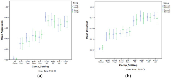 A two-way repeated measures ANOVA was run to determine the effect of compression settings measured to have or not have distortion and the interaction effect of the three songs and compression settings on an aggressive sound quality. Mauchly’s test of sphericity indicated that the assumptions of sphericity had been violated for the two-way interaction between the song and settings χ2(2) = 71.82, p = 0.001. Therefore, a Greenhouse–Geisser correction was applied (ε = 0.578). Mauchly’s test of sphericity indicated that the assumptions of sphericity had not been violated for the effect of the settings χ2(2) = 7.45, p = 0.593.