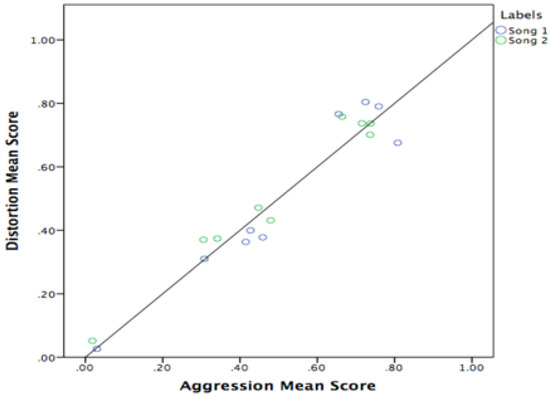 The mean scores for aggressive and distortion were analyzed to assess if there was a statistically significant correlation between the scores. Both variables (aggressive and distortion) for both songs were normally distributed, as assessed by a Shapiro–Wilk test (p > 0.05); thus, the variables were investigated for correlation. Pearson’s product–moment correlation was run to determine the relationship between perceived aggressive and distortion scores and the results show that there is a strong correlation between the mean scores for aggressive and distortion, which is statistically significant for song one (r = 0.960, n = 9, p = 0.001) and song two (r = 0.983, n = 9, p = 0.001). A scatter plot of the mean scores for aggressive and distortion for both songs is illustrated in Figure 5, where the correlation between the two can be clearly observed.