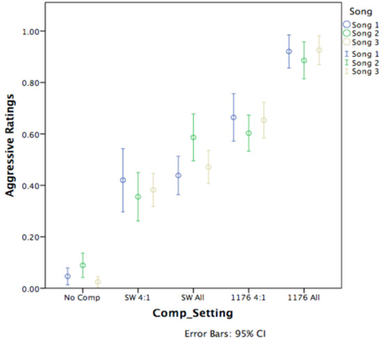 A second two-way repeated measures ANOVA was run to determine the effect of the compression settings and the interaction and compression settings of the two songs on perceived aggression. Again, Mauchly’s test of sphericity indicated that the assumptions of sphericity had been violated for the two-way interaction between the song and settings χ2(2) = 53.99, p = 0.028; thus, a Greenhouse–Geisser correction was applied (ε = 0.531). Mauchly’s test of sphericity indicated that the assumptions of sphericity had not been violated for the effect of settings χ2(2) = 27.98, p = 0.081.
