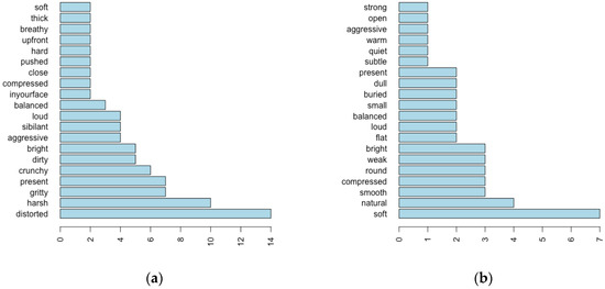 Figure 7b illustrates the descriptors used to elucidate the sound quality of the clean software compressor. The most common term is soft, and one can argue that this word is being used as an antonym for aggressive. Natural, smooth, compressed, round, weak and bright are also used by the participants to describe this compressor. Except for bright, they also appear to be terms used to describe the antithesis of an aggressive sound quality. A study carried out by Bernays and Traube [36], which investigated descriptors used to describe piano timbre, found the terms soft, velvety, round and full-bodied were connected. It is worth noting that rounded and smooth are also connected terms in Figure 1. However, further work by the author aims to obtain a better understanding of the most popular descriptors shown in Figure 7 and how they relate to the timbre of DRC.