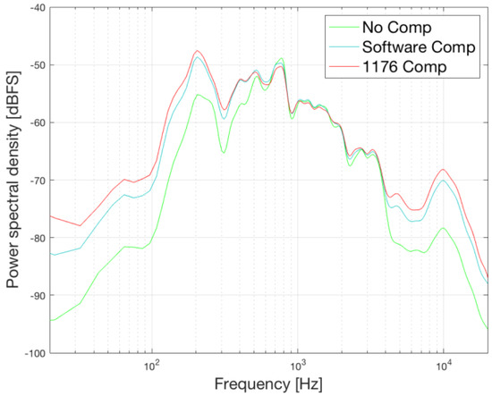Long-term average spectrum (LTAS) measurement from the uncompressed audio (green), the clean software compressor (blue) and the 1176 compressor in all-buttons mode (red).
