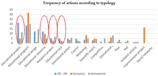 In relation to the typology of the educational designs which make up the sample, a greater frequency is detected for those which are defined as educational projects (21.31%), programs (18.27%), and educational designs (12.18%). This piece of data is a common denominator in all of the studies extracted from the observatory’s database, independently of the descriptors which define the search, as these suppose a high percentage of the total sample. However, the appearance of educational resources (12.18%) among the three most frequent typologies is worthy of note. This detail is a differential indicator, due to the fact that this typology does not appear in all cases. Rather, it depends on the descriptors of the search which define the sample. With the aim of contrasting these results with previous studies [48,49], a statistical graph was created (see Figure 1) which allows us to obtain the trends for each typology of program. In this case, a slight increase in frequency can be observed in comparison with other studies in the cases of educational resource and educational tool, both of which are teaching aids to facilitate the teaching and learning processes in educational activities and, furthermore, should ensure interaction on the part of the learner [10]. Therefore, it seems clear that using VR and AR in an attempt to bring heritage environments closer to the classroom in order to achieve existential experiences supposes an increase in these typologies. Also worthy of note is the increase in research projects which elaborate on issues of new forms of information technology (ICT) and new technology for learning and knowledge (TLK) in response to the inclusion of VR and AR in learning processes. Finally, the absence of improvement projects must be highlighted, given that in the same way as research projects, VR and AR should be one of the main objectives for achieving the advancement and improvement of the quality of education, as well as going more deeply into programs which respond to the descriptors of inclusion and attention to diversity.