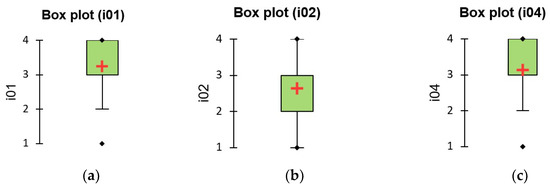The three Items with the highest scores are 1, 2, and 4 (see Figure 2). These items are mainly related to the identification of the program and the contact information. As can be seen in figures a (i01 contact), b (i02 descriptors) and c (i04 typology), the interquartile range (Q1–Q3) is situated between three and four points in Items 1 and 4 (a–c), and between two and three points in Item 2 (b). Therefore, the majority of the programs reached the level of quality required for these items of identification.