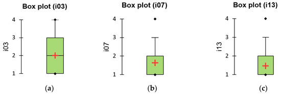 The most notable box plots: contact, descriptors, and typology. (a) (i01 contact); (b) (i02 descriptors); (c) (i04 typology).