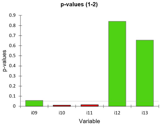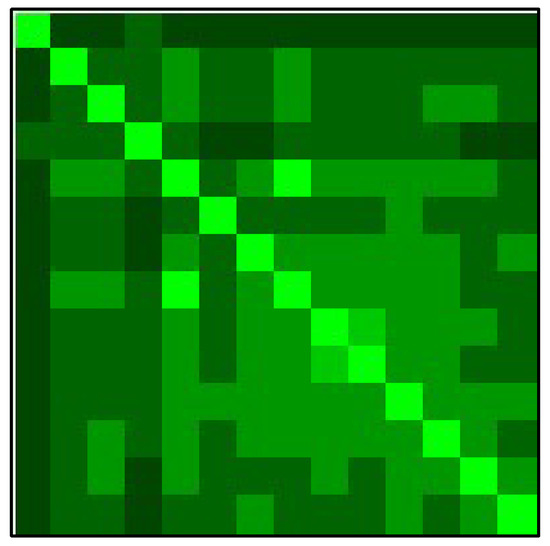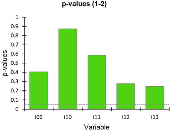 The highest correlations are among items related to the implementation of the educational design of heritage education programs (Items 9–13): the implementation of educational objectives, contents, methodology, resources, and evaluation and impact of the proposal. The correlations among these items are located between 0.50 and 0.67 and all of them have p-values <0.01. As can be seen in the image of the correlation matrix (see Figure 4), the greatest correlations arise among these items (light green). It can also be observed how Items 1 and 4 are those which present a lower correlation coefficient with the rest (these are items of identification). From these data, it is observed how the items of the educational structure (Items 9–13) find a very positive correlation, which means that regardless of the degree of scope in which they are made explicit, they are related and the proper unit of design between its parts.