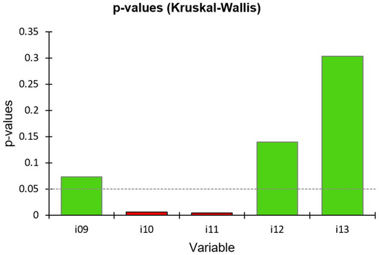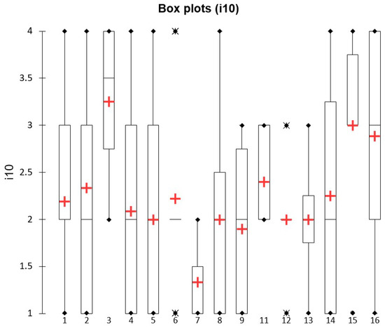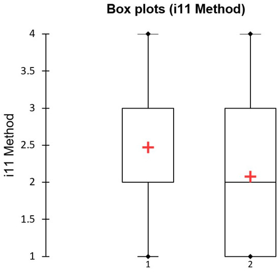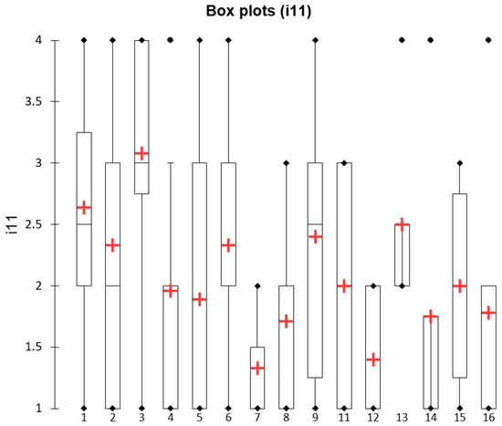 As in the previous case, the descriptive data of the averages only show notable differences between Items 10 and 11 according to the variable “type of project”. Although the typology of the project is not dealt with in a homogeneous manner, given that a significant part of the sample are programs (1), projects (2), educational designs (3), or resources (4), there were notable differences in the analysis between items according to their typology (see Table 11). The Kruskalؘ–Wallis test (see Figure 9) confirms that the average difference between Items 10 and 11 and the type of project is statistically significant (p = 0.01 in the case of Item 10 and p < 0.01 in the case of Item 11).