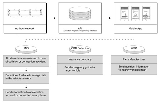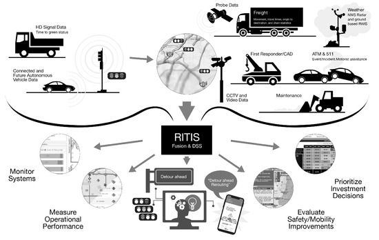 In Figure 2, the Regional Integrated Transportation Information System (RITIS) [19] shows the convergence of information that can influence road safety. A database of public infrastructure and third-party data is one way of improving transportation efficiency, security, and safety [20] via the integration of data. The collected data are interlocked with the application and secures stability.