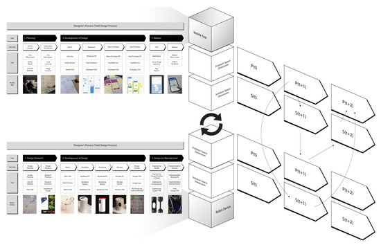 The design process consists of two sub-processes; the robot design process and the mobile app development process, which have a sequential order according to the task and guide. The order of processes is (1) robot design steps from planning to implementation, and (2) mobile app design steps from IA to release version. The process of designing a robot and a mobile app is shown in Figure 3. Both design processes were conducted in the following stages: planning research, development, and productization. Each design process contains three stages: user research, design enhancement, and productization and interactively modeled with co-evolution of problem-solution mentioned below.