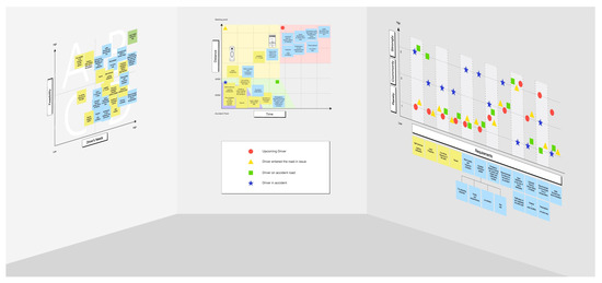 According to the affinity diagram of Figure 5, we could categorize drivers into four groups (upcoming, entered the road in issue, on the accident road, already in an accident). We arranged the user journey map belonging to the four groups of drivers, in the right side.