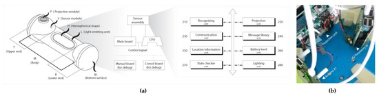 The background information mentioned in Section 3 was used for the derivation of robot design, reflecting the needs of the users. The sensor robot device is an automated input device stationed on the highways/roads, and has communication dependency with other robots as an access point. According to the requirements from the needs-based function list, the architecture of the sensor robot has a sensor assembly comprising recognizing, projection, communication, message library, location information, battery level, state checker, and light units, as shown in Figure 7.