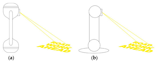 Both near and distant solutions for given road information are required, based on the findings from the user journey map, as shown in Table 2. An adjacent sensor robot device in the car accident area can provide solutions to nearby drivers by directly projecting a message from the robot device. To project the message in optical rays, at least one manipulator is required to achieve the desired angle (of laser projection). The simplest manipulator in a laser projection unit is an actuator, a base, and an R-R manipulator that rotates a total of two turns each time just before the end-effector. It is useful for projecting forward light rays to emphasize the bypass path.