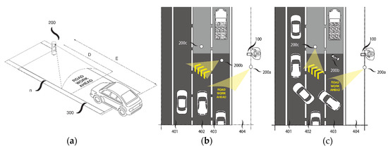 The recognition unit (the detector, labeled as 210 in Figure 7a) uses an ultrasonic sensor to measure the distance to the vehicle approaching the sensor robot device. The detector uses an ultrasonic to a RADAR (or LIDAR) sensor, which uses frequency bands in the range of 20 kHz to 79 GHz to measure the distance from an object. Besides the ultrasonic sensor, the detector includes a sensor equipped with a position-sensitive detector sensor, a charge-coupled device image sensor, and an infrared (IR) sensor to identify the presence and distance of the vehicle.