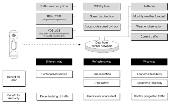 On the other hand, We focused this research mainly on user experience. This research aims to propose multiple access point robots along highways and roads to safely and conveniently provide useful information for users. The real-time communicative sensor robot system provides users with information on detours from busy roads to prevent secondary vehicle accidents [3] or allows them to select alternatives among other transportation modes in their enhanced experience. For these purposes, mobile applications (apps) simultaneously connected with open application program interfaces (APIs) become useful for providing information.