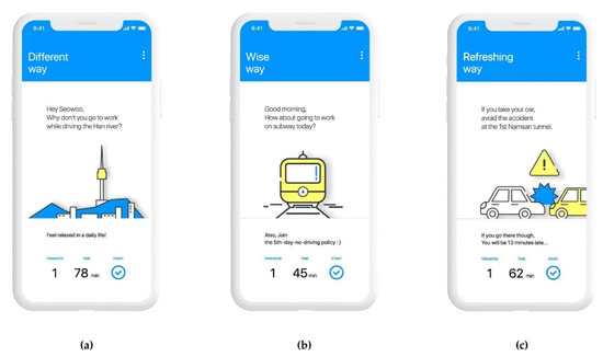 The information architecture was designed to provide three contextual value services to users. The AI-based value creation proposed by this system leverages data from road traffic environments and map information systems to help coordinate overall traffic. The three case studies, [6]—(1) Different way to work, (2) Wise way to work, (3) Refreshing way to work—seek to instill a happy memory of the commuting journey. To all users who commute through highways/roads, this application will contribute to creating a balanced condition by providing stable route options, as shown in Figure 14b.