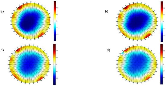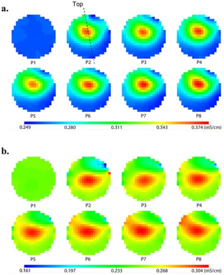- Linear methods (single-step and iterative methods): In this approach, images are generated by simply multiplying the measurements by a pre-calculated matrix, and consequently they are quite fast in terms of computational effort. Among the linear methods, Linear back-projection (LBP) is the most widely used (the used matrix is the transpose of an estimated solution of the forward problem [82]). Nevertheless, they are usually non-iterative methods. Images obtained by means of LBP are low-resolution, heavily smoothed ones, because the transpose of the forward problem solution is a poor estimate of the solution to the inverse problem. To circumvent some of these limitations, an iterative back projection algorithm was proposed by Yang et al. [83]. Linear methods have been improved by including approaches based on ridge-regression and eigenanalysis [84].
