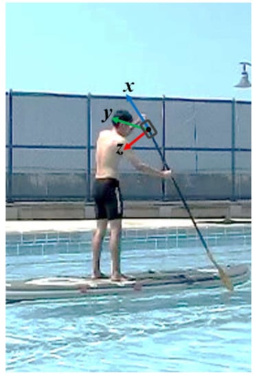The testing site was an outdoor swimming pool that was 25 m long. To maintain the forward movement when paddling, participants alternated sides after three strokes. Each participant paddled back and forth twice in a high kneeling position and a standing position in a random order. Participants were instructed to paddle at a comfortable speed to simulate a real paddling situation. Generally, data for 5–6 strokes could be recorded in a 25 m swimming pool. Data in the acceleration and deceleration periods were discarded. Finally, only one data set captured, when the participants moved just halfway across the pool, was adopted for analysis. A total of four trips contained four records.