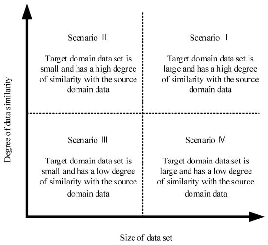 When transferring a deep learning PHM algorithm, it is necessary to specify the transfer scenario. The similarity between the target domain and the source domain and the amount of data in the target domain are important indicators for the choice of transfer method. Therefore, according to the similarity of data and the size of data set in the target domain, the transfer scenarios of deep learning PHM algorithm are divided into four categories. Figure 1 shows the four types of scenarios for deep learning PHM algorithm transfer.