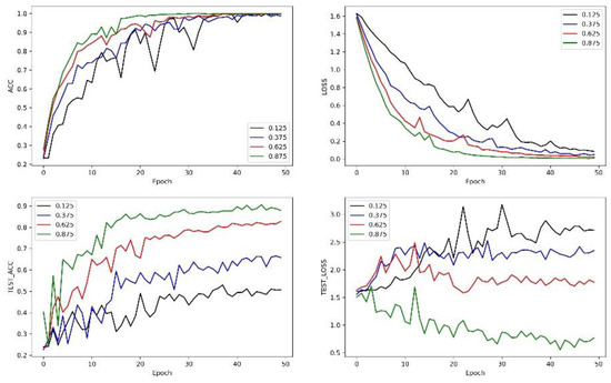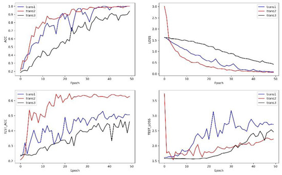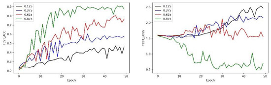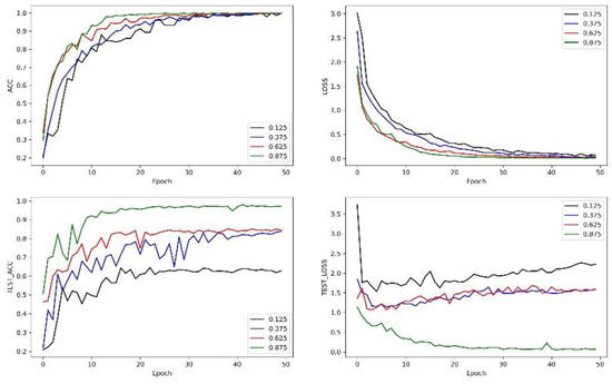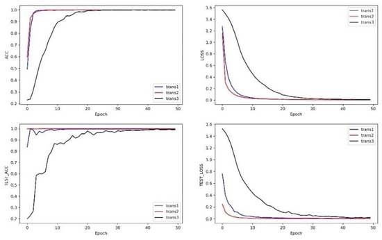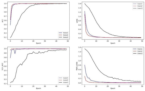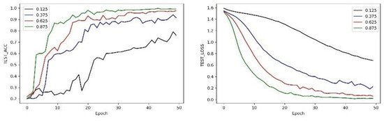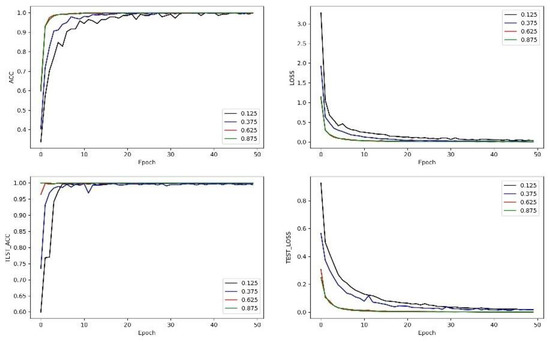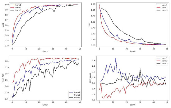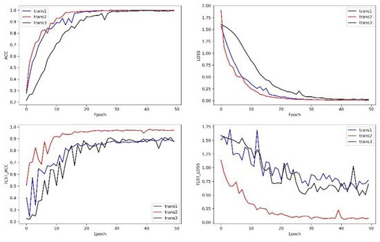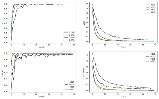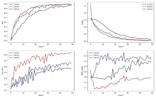 Figure 8, Figure 9 and Figure 10 show the training accuracy, training loss, test accuracy and test loss for TM1, TM2, and TM3 for the four groups of experiments. From the changes in training accuracy and training loss, it can be seen that the size of data in the target domain has a small effect on the final fitting degree of the training, but the bigger the size of data, the faster the diagnostic algorithm converges and the shorter the time it takes to obtain a higher training accuracy. From the changes in test accuracy and test loss, it can be seen that when the target and source domains are similar, TM1 and TM2 are not sensitive to the size of data in the target domain, and TM3 is sensitive to the data in the target domain. The larger the size of data, the better the algorithm’s final fault diagnosis effect.
