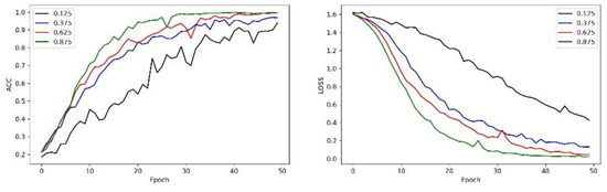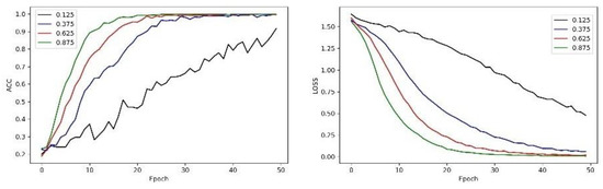 According to the ratio of the target domain of the source domain data, the data is divided into four groups. The target domain data size is 0.125 (this means the percent of used data and full data), 0.375, 0.625, and 0.875, respectively. We define a data set that is less than 50% of the total data as a small data set and a data set that is greater than 50% as a large data set. The impact of different target domain data size and transfer methods proposed in Section 3 on the transfer results was verified. The transfer process is shown in Figure 7. In TM1, the network weights are fully multiplexed from the source domain network and not need initializing. In TM2, the weights of the classification layer are initialized via glorot_uniform, and the remaining layers reuse the source domain network. In TM3, all network weights are via glorot_uniform.