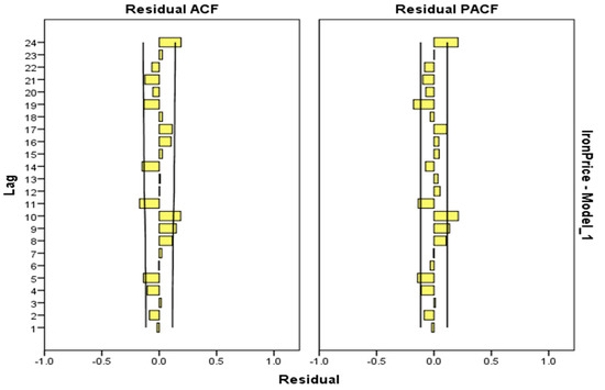 Box and Jenkins [85] developed a general forecasting approach to predict future points in the time series. ARIMA can be applied in some cases where data show signal of non-stationarity. In this approach, the future value of a variable is presumed to be a linear function of periodic past explanations and random errors. This model is known as ARIMA (p, q, d), where p stands for number of time lags of the autoregressive model, q is the instruction of moving-average parameters, and d is the number of times the data have had past values subtracted [86]. The 𝑑 parameter is estimated by the number of times the differencing is achieved on the time series [87]. In order to build the best ARIMA model for forecasting of iron ore price, 𝑝 and 𝑞 parameters have to be efficiently determined for a proper model. To estimate the best model, we use the criteria as follows: Bayesian information criterion (BIC), R-squared, root-mean-square error (RMSE), mean absolute percentage error (MAPE), and mean absolute error (MAE). Table 2 shows the different parameters 𝑝, 𝑞, and d in the ARIMA model. ARIMA (0, 1, 1) shows the best performance compared to other presented models in Table 2. The residual plots of autocorrelation function (ACF) and partial autocorrelation function (PACF) in Figure 3 shows the model is adequate as it shows a random variation from the origin zero (0), the points below and above are all uneven, hence the model fitted is acceptable.