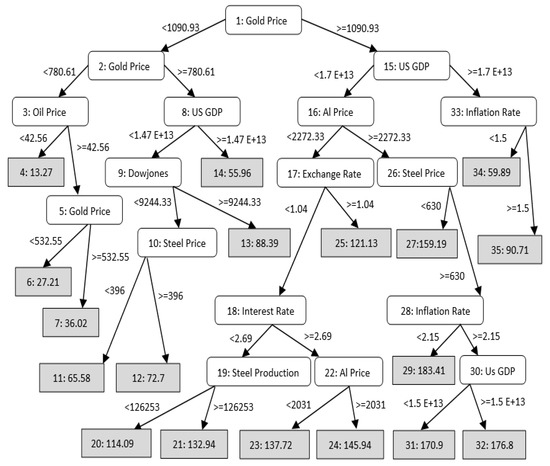 The CART model was developed by Breiman et al. [92] which can be made into a two-scale tree on the basis of some rules. This algorithm gives the capability to be used in parameters concerning quality and quantity. If the dependent parameter is of quantity type, the formed tree is called the “Regression tree,” and if it is of the quality type, it is named “Classification tree.” Parameters such as the “Maximum tree depth” and “Number of intervals” as controlling parameters are taken into consideration in this algorithm to avoid extreme complications of the model [92]. The MATLAB software was used to build the CART model. Many CART models considering the most effective parameters on this model, have been constructed and the best model among them was selected to predict price of iron ore. Figure 4 shows the desirable tree for modelling the iron ore price. In addition, Figure 5 displays the predicted iron ore price by CART verses their measured values. Based on this figure, R2 is determined as 0.936 which revealed that the CART predictive model is able to estimate the iron ore price with high level of accuracy.