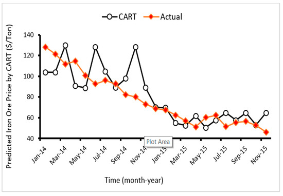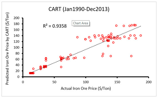 Scatter plot of the predicted vs. actual iron ore price through the use of classification and regression tree (CART) model.