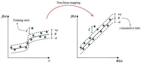 Support vector machine (SVM) was introduced to solve both classification and regression problems. Among many methods of machine learning, the SVM is considered as a relatively new technique which is based on the structural risk minimization [93]. SVM can be referred to both regression and classification methods. Among them, support vector regression (SVR) is only able to solve extrapolative problems by building a predictive model. The SVR works based on regression estimation and function approximation considering an alternative “loss function.” The SVR is defined as a common technique which is based on the Vapnik-Chervonenkis (VC) theory [94,95]. If the VC dimension is low, the expected probability of error is also low, which means good generalization [96].
