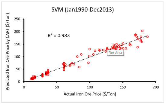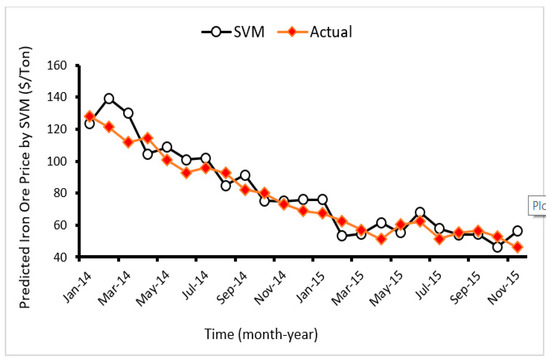 Mentioning about statistical equations behind SVM and SVR is out of scope of this study. In order to have a detailed view of SVM and SVR, studies conducted by Hasanipanah et al. [97] and Mahdevari et al. [98] are suggested. Generally, to construct a SVR model, three factors are very important to determine. These factors are the Gaussian kernel parameter γ, the loss function parameter ε, and the penalty term C [98]. A series models of SVR were built defining a fitness function in three loops for each combination of C, ε, and γ. Then, the optimum C, ε, and γ in each run was selected. Table 3 presents the obtained results of the developed SVR models in terms of performance indices i.e., R2, root mean square error (RMSE) and mean absolute error (Ea). In addition, different combinations of C, ε, and γ can be seen in Table 3. As shown in Table 3, model number 9 (R2 = 0.98, RMSE = 6.63, Ea = 3.84 and) outperforms the others. The results demonstrated a high level of accuracy of SVR in estimating iron ore price. Correlation between predicted and measured values of iron ore price using SVR predictive model is displayed in Figure 7.