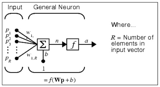 Artificial neural network (ANN), as it is apparent from their name, are computational networks which are used for simulation of the network of brain neural cells in living creatures. Current knowledge of biologic scientists about the activity of neural neurons in the past few decades is the basis of designing such networks. Neural networks obtain their needed rules through teaching educational teaching. Neural networks use different algorithm for learning but without attention to applied method, learning is generally a repetitive operation during which a set of educational examples are shown to the network so as to help it be thoroughly taught [99,100,101]. So, distribution is the most common learning algorithm of multi-layer neural networks with leading nutrition invented by Rumel Hurt. This method changes connection weights by slope reduction and minimizes error function [61,62,102,103,104,105]. A neural network is composed of a number of neurons in consequent layers. Basically, three layers exist for such networks: an input layer, one or more middle layers in addition to existing neurons in each layer defined based on complexity of the issue through trial-and-error method. A simple network with leading nutrition of input R is presented in Figure 8 [106].