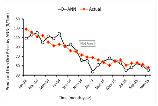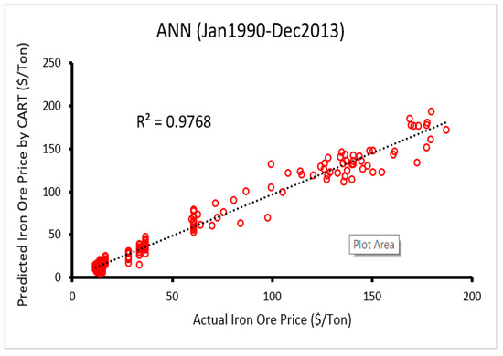 Many researchers highlighted application of ANN in various fields of civil and mining works (e.g., [111,112,113]). A number of ANN models with different topology were built and among them, an ANN model with higher accuracy level was chosen. The most influential factors i.e., hidden layer No., No. of nodes in each hidden layer, and the applied transfer function were considered in modeling process. A network with architecture 12-6-1 with minimum error was found to be optimum. R2 was determined between the predicted and the measured values as 0.977 for the optimum ANN model (see Figure 9) which shows capability of this model in predicting iron ore price.
