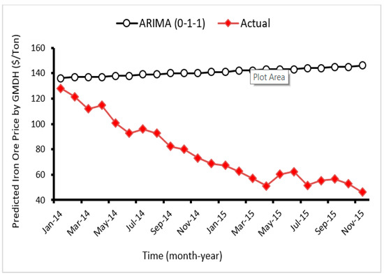 where, y and y′ are the measured and predicted values, respectively. In addition, N in total number of datasets [120]. In order to validate/test the proposed models, the selected datasets which were not used in the modelling process (23 databases from January 2014 to November 2015) were applied and then predicted. Subsequently, the obtained results from testing step were compared with the measured iron ore price values as shown in Figure 10, Figure 11, Figure 12, Figure 13 and Figure 14 for ARIMA, CART, ANN, SVR, and GMDH models, respectively. As shown in these figures, the measured and predicted values by GMDH are closer to each other compared to other proposed models. This confirmed that the GMDH model which is a new model in the area of this study is able to perform well for prediction of iron ore price. It is a powerful and practical predictive model for such purposes.
