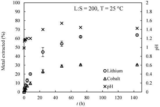 The time-transient evolution of the dissolved metal ( and ) from the solid matrix and of the solution pH are presented in Figure 2. The solid dissolution trend was approximately linear in the first few hours of the experiment, slowing down asymptotically as the particles were dissolved. It could be concluded that the kinetics of particle dissolution was moderately slow, reaching a plateau after approximately 3 days. Regarding the pH evolution, a slight increase from pH = 1 to pH = 1.4 was observed, which could be associated with the consumption of protons during the extraction process. A non-equimolar proportion between Li+ and Co2+ was also observed; that is, the concentration of Li+ in the equilibrium was approximately twice as high as the concentration of Co2+.