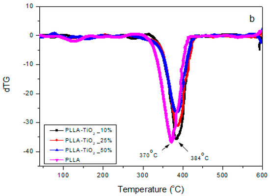 (a) Mass loss and (b) DTG curves of prepared PLLA GO–TiO2 films.