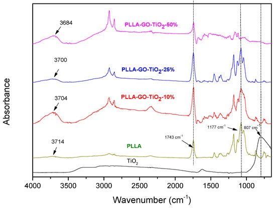 Some interactions between inorganic fillers and PLA matrix can be also responsible for this restriction to chain mobility. This was confirmed by FTIR spectroscopy (Figure 3). The main absorption peaks were observed at 3020 and 2943 cm−1, 1743 cm−1 and 1177 cm−1 due to CH stretching of methyl and methylene groups, stretching mode of the carboxyl ester groups and C-O groups, respectively. Additionally, some additional peaks were recorded at 1454 and 1381 cm−1, due to the asymmetric and symmetric deformation of CH3 group and one broad and weak peak in the area 3500–3800 cm−1 with a maximum at 3714 cm−1 corresponding to the –OH end groups. TiO2 nanoparticles have characteristic peaks at 807 cm−1 corresponding to Ti–O–Ti groups and a broad peak of Ti–OH groups at 3200–3500 cm−1. On the other hand, GO exhibits lot of reactive groups like –OH, –COOH and epoxy groups. Absorption peaks hovering around 1630 cm−1 was attributed to the C–O stretching vibrations of the COOH groups, while strong adsorptions at 1395 cm−1 1060 cm−1 were assigned to the –C–OH deformations and C–O stretching vibrations, respectively. Moreover, exhibition of a peak at 1215 cm−1 which was indexed to asymmetric stretching of C–O–C bridges in epoxy groups was observed [51]. However, due to its low amount in the prepared films (1 wt%) none of these peaks could be found in the recorded spectra. Comparing the spectra of prepared films with these of neat PLLA some characteristic shifts can be seen in the area of hydroxyl groups. In all nanocomposites the –OH absorbance is progressively shifted to lower wavenumbers by increasing the TiO2 amount. This is an evidence that some interactions may are taking place between the –OH end groups of PLLA and TiO2. On the contrary, the carbonyl group peak at 1743 cm−1 remains stable, which is a proof that these peaks are not participated in any kind of interactions with TiO2 groups.