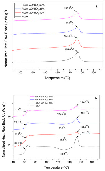 The addition of GO and mainly TiO2, which is in much higher amount compared with GO, nanoparticles affects also thermal properties of PLLA. As can be seen from Figure 4a PLLA is a semicrystalline material with melting point at 154.3 °C while the addition of nanoparticles causes a small reduction in melting point (about 1°C). This reduction seems not to be affected from the addition of TiO2 amount. The same behaviour is observed in nanocomposites after quenching, in which the malting point is recorded at about 152–153 °C (Figure 4b).