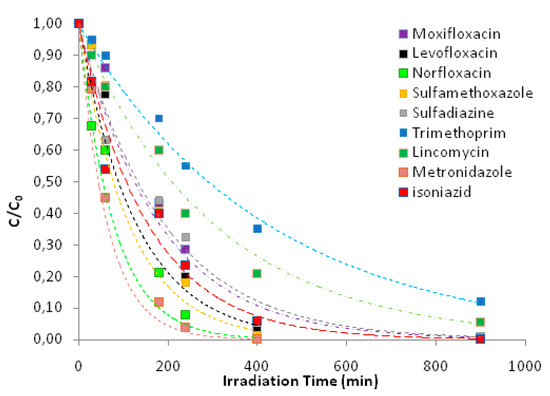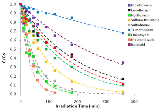 More specifically, most of the compounds appear to be quite susceptible to photocatalysis since they are more than 90% degraded within 180 min of treatment while moxifloxacin, trimethoprim and lincomycin require more prolonged treatment.