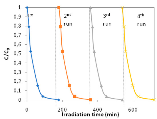In order to achieve the maximum efficiency of a catalyst, recycling and reuse are significant parameters to be investigated. Under this light, the photocatalytic activity of the PLLA–GO–50 wt% TiO2 composite film was tested for four cycles. After each cycle the nanocomposite film was withdrawn from the reactor, washed with deionized water, dried and prepared for the next run.