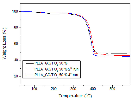 Moreover, TGA analysis has been conducted in all PLLA-GO/TiO2 50 wt% films after several photocatalytic runs. As it can be seen in Figure 9, after the second run the mass loss is much higher, compared with the sample before photocatalysis, and the remaining char is about 45.8%. This is an indication that some small amount of TiO2 (about 2.3%), which was probably located at the surface of prepared films, was removed during photocatalysis. This phenomenon was also repeated during 4th run where an additional 1.1% of TiO2 was lost, since the remaining char is 44.7%. Similar results have been found in our previous studies in PET/TiO2 films [24]. This removal can also explain the porosity of used firms after several photocatalysis runs.
