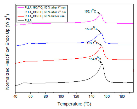 Due to this small loss of TiO2 during photocatalysis, very small differences have been also detected with DSC in PLLA–GO–50 wt% TiO2 composites after several photocatalytic cycles (Figure 10). PLLA–50 wt% TiO2 composite before its use has a melting point at about 153.1 °C, which remains almost the same after the second run and slight shifted to 152.1 °C after the fourth run.