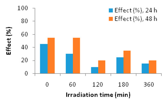 Since the formation of various transformation products throughout treatment may pose environmental risks [59] the evaluation of the changes in toxicity during treatment is indispensable. In the present study a Daphnia magna toxicity bioassay was applied to samples taken during the photocatalytic treatment and the immobilization of the organisms expressed as the % effect after 24 h and 48 h of exposure was determined. In Figure 11, the results from the bioassay are depicted.